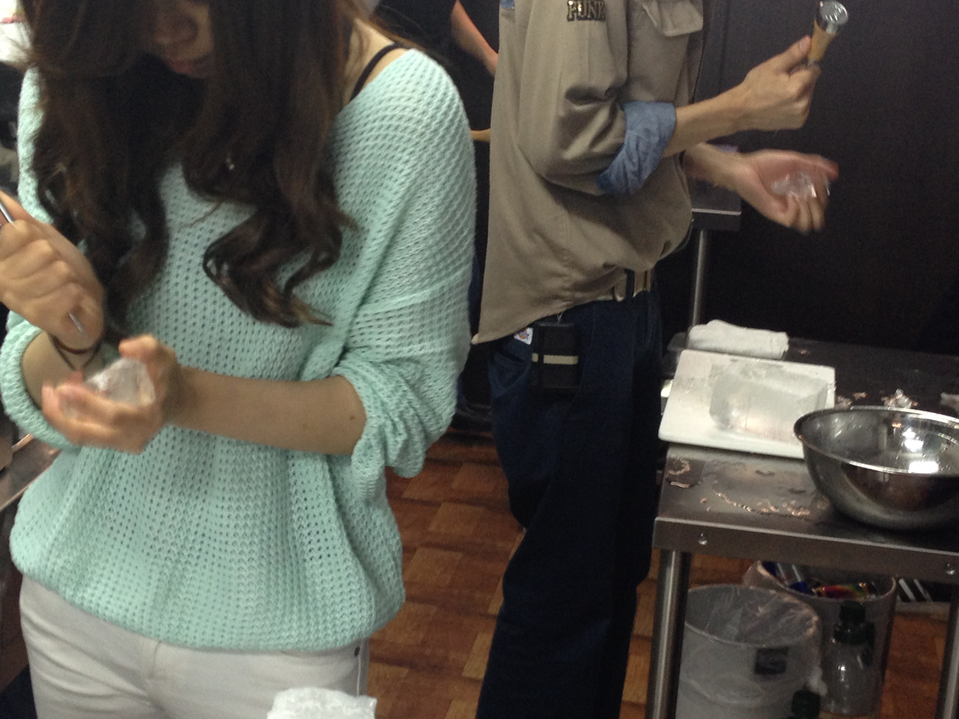 シキューブアイスから丸いロックアイス(写真)まで生徒さんが割りました^_^ 初めてのロックアイス作りを記念してみんなで撮影をしました。 この写真が奇跡の一枚です‼