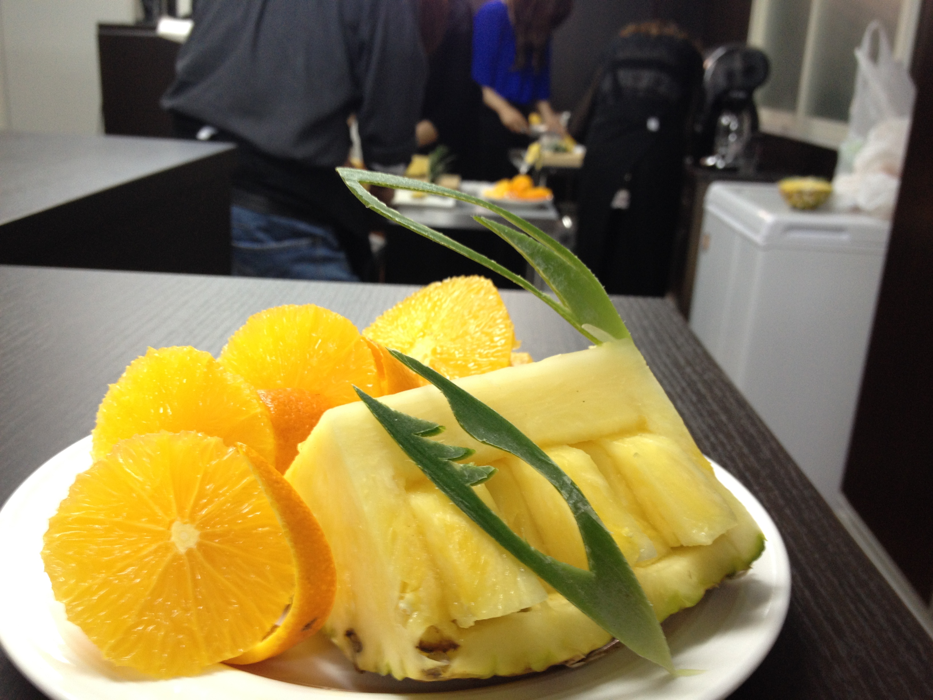 休憩時間に去年のカクテルコンクール全国大会のフルーツカット部門優勝者の動画を見ました。まな板を綺麗に使う事や、姿勢の良さなど参考になったようです。授業は実習の他にこのような動画も利用して進めていきます。