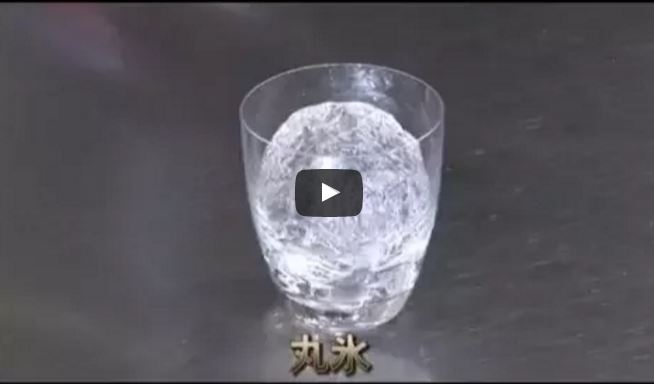 写真はウイスキーなどのロックを提供する時に使用する丸い氷です。 バーで使う氷には、キューブアイス、クラッシュドアイス、シェーブドアイス、ロックアイスなど様々な種類があります。 授業では1貫目といわれる3.75kgの氷の塊から全ての氷を作ります。
