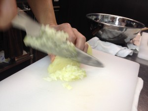 本日1日目は包丁の持ち方からはじまり、野菜のカット方法、トマトソース作製、ハンバーグ作成というカリキュラムでした。