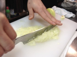 玉ねぎのみじん切りですがしっかりと包丁を動かして切る事で余分な水分が出なくて目が痛くなりませんでした。