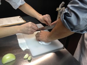 生徒の包丁の持ち方や、包丁の動き方も基本に忠実に修正していきます。