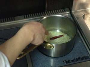 この時鷹の爪はカットすると辛みが増します。今回はベースとなるトマトソース作成ですのでカットせずにそのまま入れます。