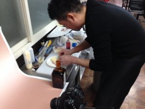 工事が終わり出来上がった店舗にて校長の坪井が見本を見せながらお店の味(レシピ)を卒業生の高山さんと一緒に決めていきました。