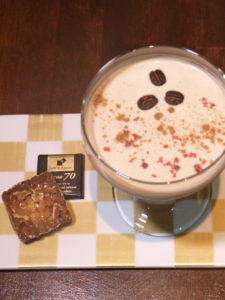 コーヒー豆をブレンデーに2週間ほど漬け込んで(インフュージョン)して香りを移してから作るアレキサンダーです。シナモンパウダーとピンクペッパーがアクセントになっています。